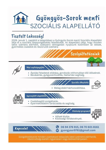 Értesítem Önöket, hogy 2026.01.01. napjától a Gyöngyös-Sorok menti Szociális Alapellátó vette át a házi segítségnyújtással kapcsolatos feladatot a Pálos Károly Szociális Szolgáltató Központtól.